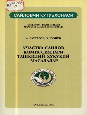 Участка сайлов комиссиялари: ташкилий-ҳуқуқий масалалар [Matn] / А. Саттаров, З. Рузиев ; Ўзбекистон Республикаси Марказий сайлов комиссияси ; Саттаров А., Рузиев З. . - Тошкент : O'zbekiston , 2014 . - 32 б . - (Сайловчи кутубхонаси) . - 10000 нусха . - ISBN 978-9943-28-181-3 : 5000 сўм.
