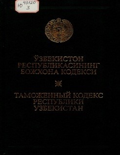 Ўзбекистон Республикасининг Божхона кодекси [Matn]: (2014 йил 1 октябргача бўлган ўзгартиш ва қўшимчалар билан): (С изменениями и дополнениями на 1 октября 2014 года)Ўзбекистон Республикаси Адлия вазирлиги. - Расмий наш. - Тошкент: Адолат, 2014. - 204 б. - 2000 нусха. - ISBN 978-9943-4378-3-8 (муқовада): 10500 сўм
