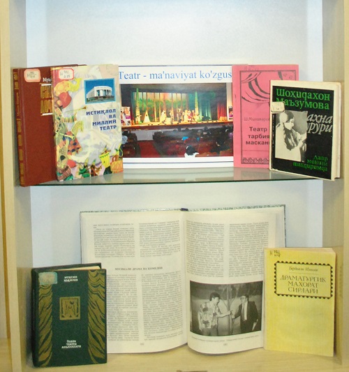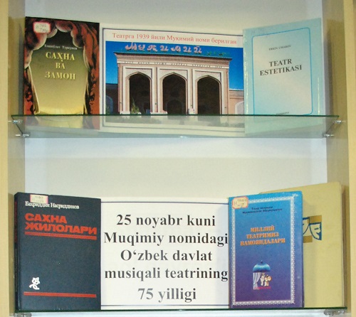 На книжной выставке, посвящённой 75-летию Узбекского Государственного Музыкального театра имени Мукими, выставлены книги из фонда библиотеки, рассказывающие о драматургии, об известных драматургах, актёрах и представителях театрального искусства.