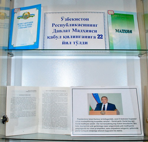 В читальном зале “Адолат” Национальной библиотеки Узбекистана организованна книжная выставка, посвящённая 22 годовщине принятия Закона «О Государственном гимне Узбекистана».