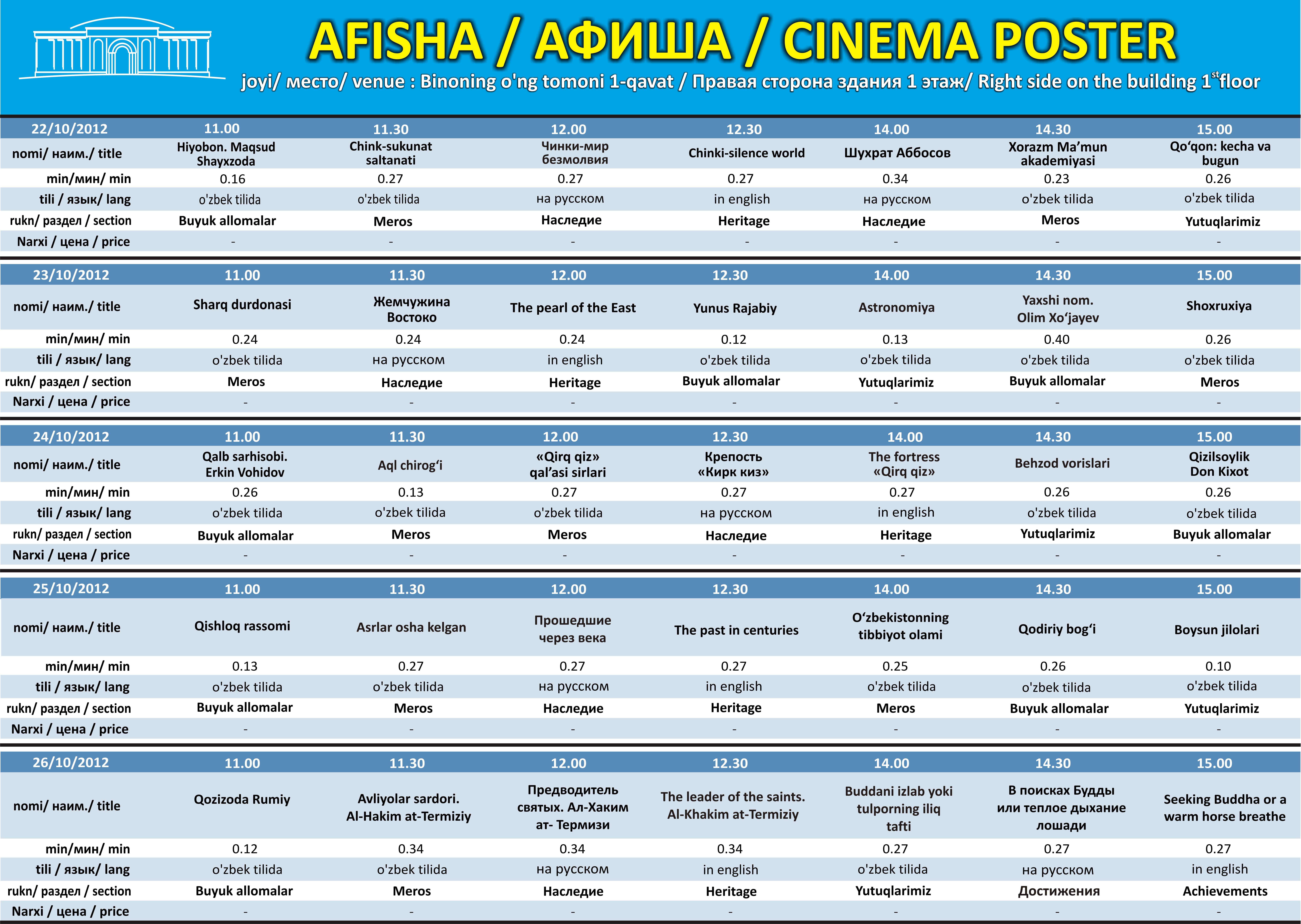 В каждом разделе демонстрируются документальные фильмы, произведенные в Республики Узбекистан, рассказывающие об исторических личностях оставивших след в нашей истории, внесший свой неоценимый вклад в развитие мировой науки и цивилизации, о культурных, исторических, этнографических, архитектурных памятников, а также результатах и достижениям современного и независимого Узбекистана, демонстрирующих успехи проводимых реформ в общественно-политической сфере.