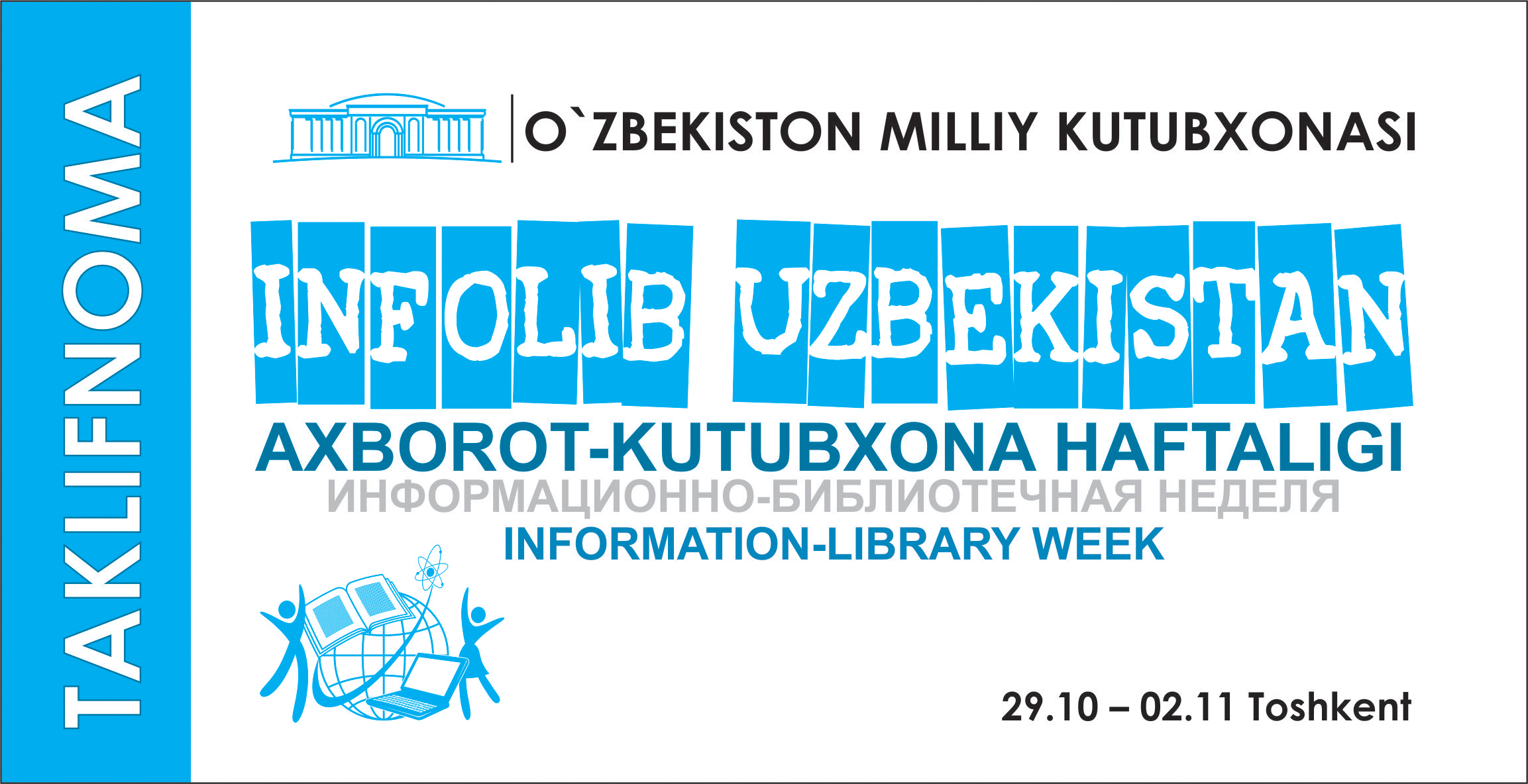Национальная библиотека Узбекистана приглашает Вас принять участие в Национальной информационно-библиотечной неделе, главной целью которой является повышение уровня информационной культуры, вклад в развитие национального контента в сети Интернет, популяризация чтения и повышение возможностей Интернет в трансформации информационно-библиотечного обслуживания.