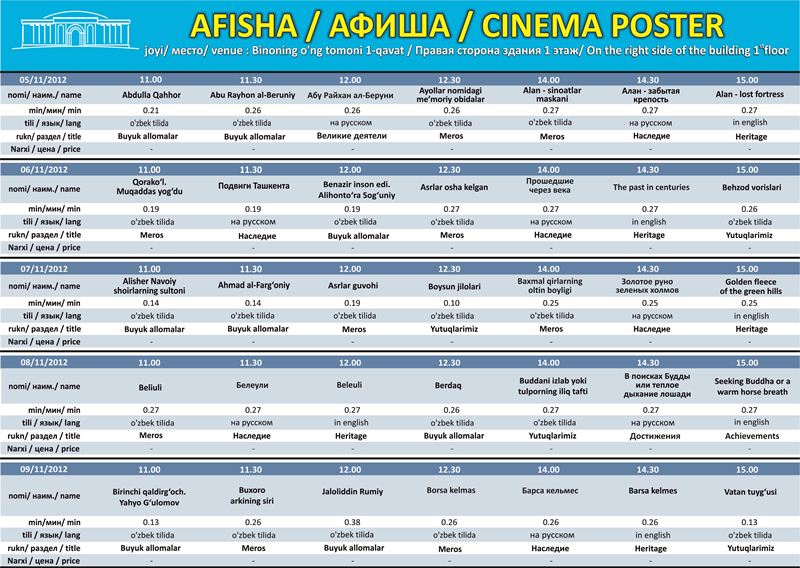 Фильмы демонстрируются на узбекском, русском и английском языках каждый день, кроме выходных с 11:00 до 16:00. Киноцентр находится на 1 этаже библиотеки с правой стороны и имеет 45 посадочных мест. Основная цель демонстрация тематических фильмов и видеоресурсов образовательной и познавательной направленности. Все фильмы демонстрируются бесплатно. В планах Национальной библиотеки приобретение художественных фильмов составляющих в золотую коллекцию узбекского кино для тематической иллюстрации в качестве видеоприложения к проводимым мероприятиям – встречам, посвященных тем или иным классикам узбекской литературы, поэзии и искусства.