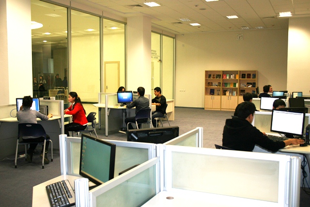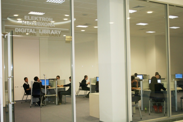 На первом этаже с правой стороны национальной библиотеки функционирует электронная библиотека.