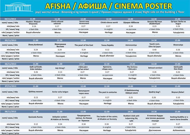 Национальная библиотека обновила свой еженедельный репертуар документальных фильмов демонстрируемых в киноцентре библиотеки. В репертуар киноцентра включены видеоматериалы по трем основным направлениям: «Бизнинг мерос- Наше наследие», «Буюк арбобларимиз – Наши великие деятели», «Бизнинг ютукларимиз – Наши достижения.