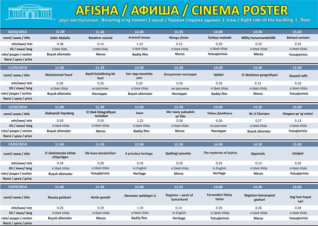 Фильмы демонстрируются на узбекском, русском и английском языках каждый день, кроме выходных с 11:00 до 16:00. Киноцентр находится на 1 этаже библиотеки с правой стороны и имеет 45 посадочных мест. Основная цель- демонстрация тематических фильмов и видеоресурсов образовательной и познавательной направленности. Все фильмы демонстрируются бесплатно.Подробнее о репертуаре киноцентра можно узнать из нижеприведенной еженедельной афиши.