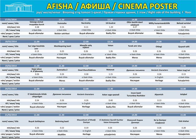 Фильмы демонстрируются на узбекском, русском и английском языках каждый день, кроме выходных с 11:00 до 16:00. Киноцентр находится на 1 этаже библиотеки с правой стороны и имеет 45 посадочных мест. Основная цель- демонстрация тематических фильмов и видеоресурсов образовательной и познавательной направленности. Все фильмы демонстрируются бесплатно.Подробнее о репертуаре киноцентра можно узнать из нижеприведенной еженедельной афиши.
