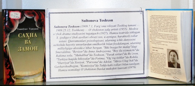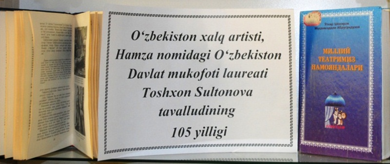 2014 yil 17 yanvar kuni Alisher Navoiy nomidagi O‘zbekiston Milliy kutubxonasining “Ijod” o‘quv zalida O‘zbekiston xalq artisti, Hamza nomidagi O‘zbekiston Davlat mukofoti laureati Toshxon Sultonova tavalludining 105 yilligiga bag‘ishlangan ko‘rgazma tashkil qilindi. Ko‘rgazmada Toshxon Sultonovaga mansub asarlar hamda uning hayotiga bag‘ishlangan kitoblar namoyish qilindi.