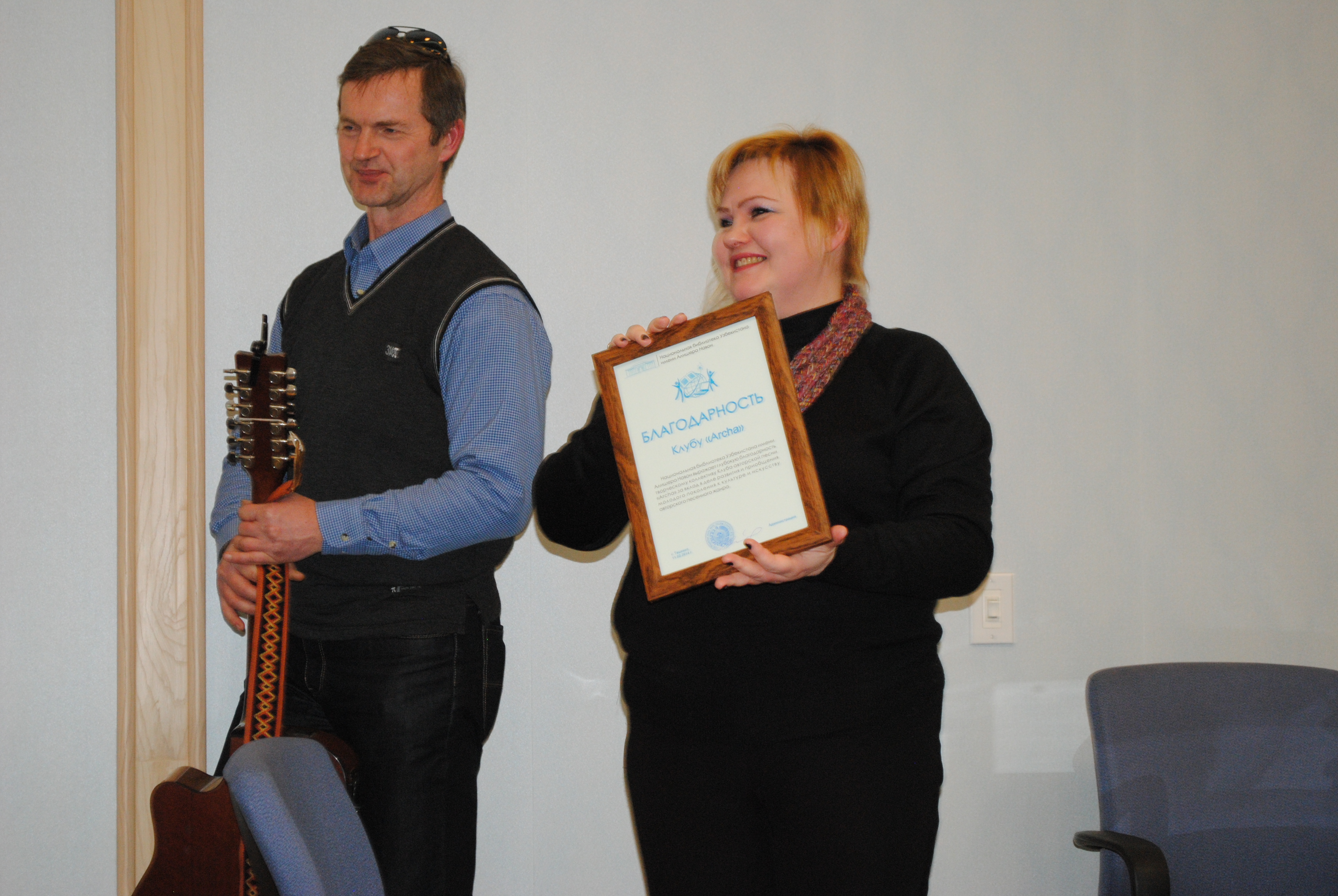 2014 yil 11 fevral kuni Alisher Navoiy nomidagi O‘zbekiston Milliy kutubxonasining majlislar zalida mualliflik qo‘shiqlarini ijro etuvchi “Archa” guruhi bilan ijodiy uchrashuv bo‘lib o‘tdi. Tadbir o‘tkazishdan asosiy maqsad qo‘shiqchilik san'ati bilan yoshlarni yanada yaqinroq tanishtrish, klub a'zolarining o‘z tajribalarini yoshlar bilan o‘rtoqlashishdan iborat. Tadbirda mualliflik qo‘shiqlari bo‘yicha xalqaro va maxalliy festivallar laureati, V.Pushkin nomidagi festival jyuri a'zosi - Leonid Puzerev, O‘zbekiston va Qozig‘istondagi xalqaro festivallar laureati - Vladislav Mayevskiy, Nodira Ziyaxanova, shoira, “Anxor” art-studiyasi rahbari Svetlana Klokotovalar qatnashdilar. Ular o‘z ijodlaridan jonli tarzda qo‘shiqlar kuylab berdilar.